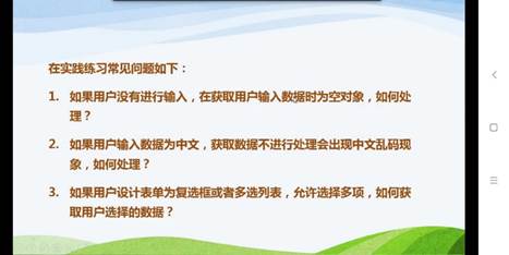 带着提出的三个问题,开始本节课的学习,通过完成三个教学小任务进行课程知识点剖析讲解。首先对比null对象与空串的区别,给出null对象抛出异常时的解决方案;然后讲解进行中文信息处理的两种方法并给出其应用场景及区别;最后通过实例演示讲解获取复选数据的方法getParameterValues()的功能和使用。并对案例完成进行了知识点总结。整个教学过程环环相扣,连成一体,课堂上员工互动积极性比较高,师生之间通过钉钉进行交流,有效活跃了课堂气氛。