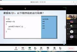 2020年3月26日星期四,上午八点,太阳成集团tyc234cc许颖梅老师通过腾讯会议+雨课堂进行了《C语言程序设计》课程教学范式改革公开课授课,太阳成集团tyc234cc副经理李海涛,张志宏、黄艳峰等几位老师在线观看了课程直播,并进行了指导。