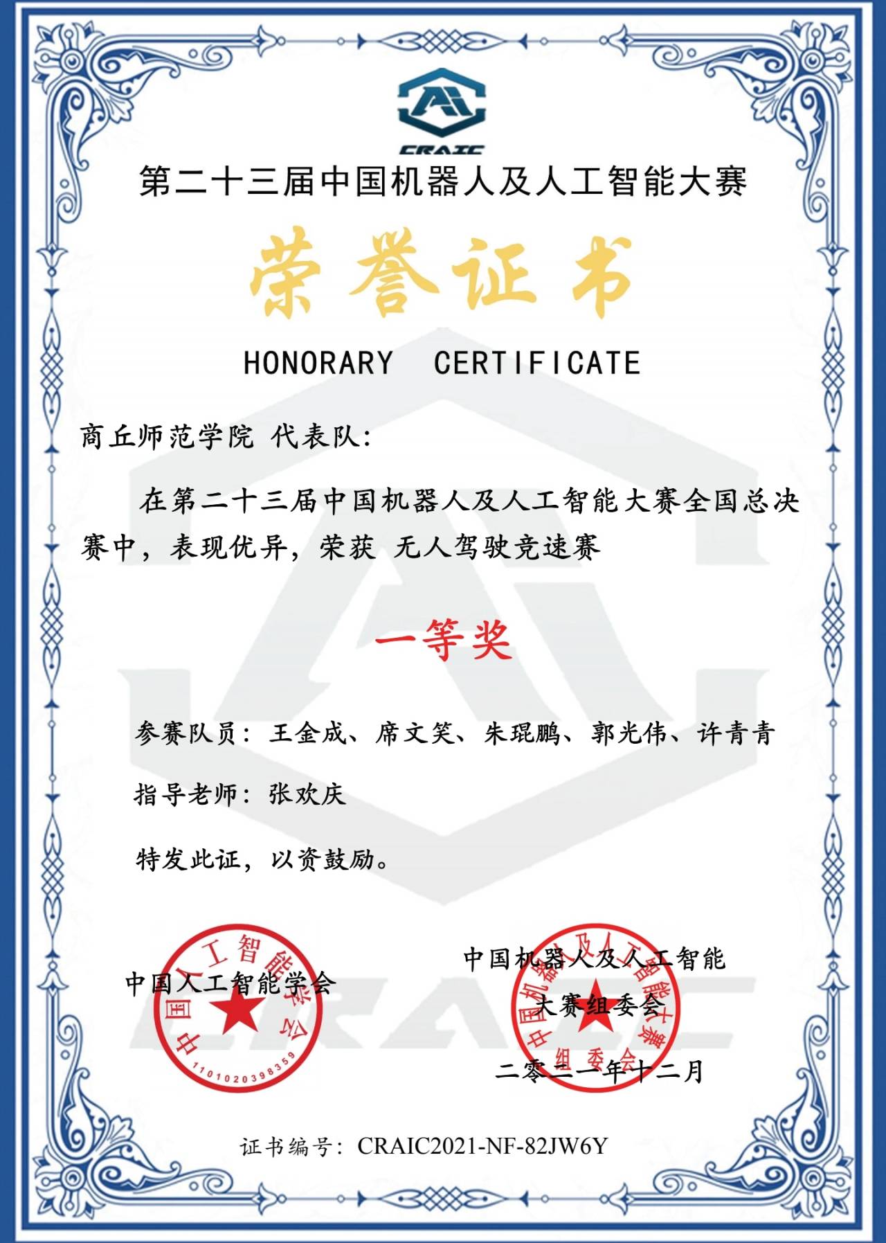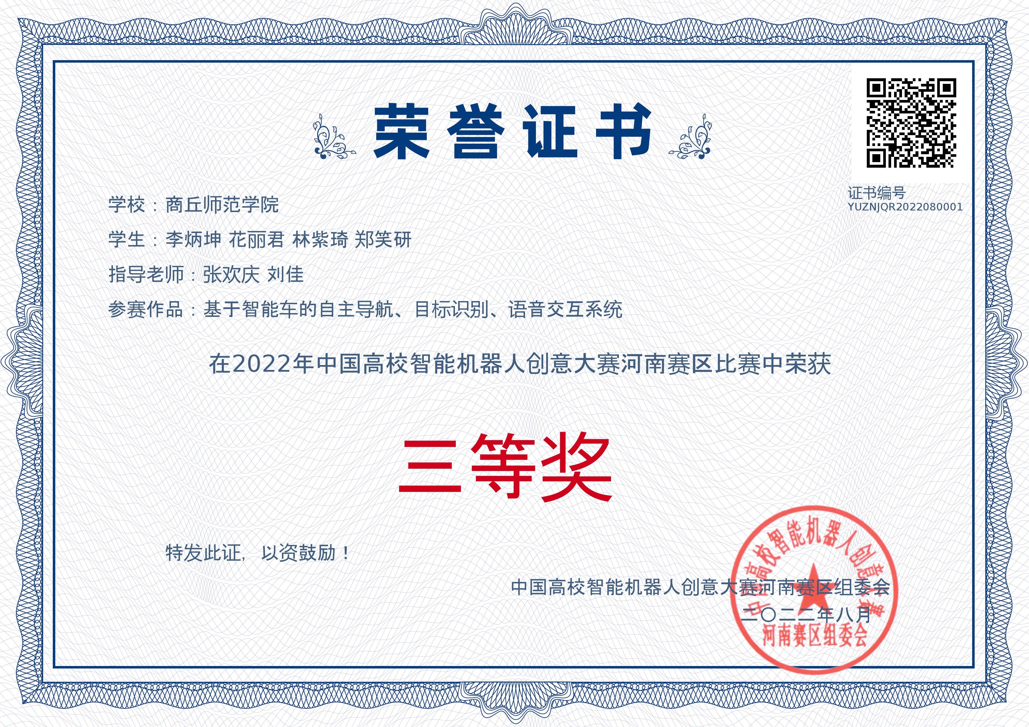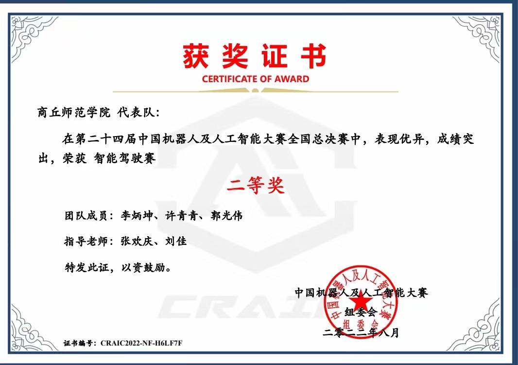 中国机器人及人工智能大赛作为中国人工智能学会最早主办的竞赛之一,该赛事是目前国内规模最大、影响力最强、专业水平最高的机器人大赛,属于国家级 A 类赛事,大赛已为我国培养了大量“能动手”、“敢创新”、“可协同”的复合型人才。指导老师张欢庆带领员工在创新类、应用类、竞技类的不同赛事下,开展人工智能算法研究。