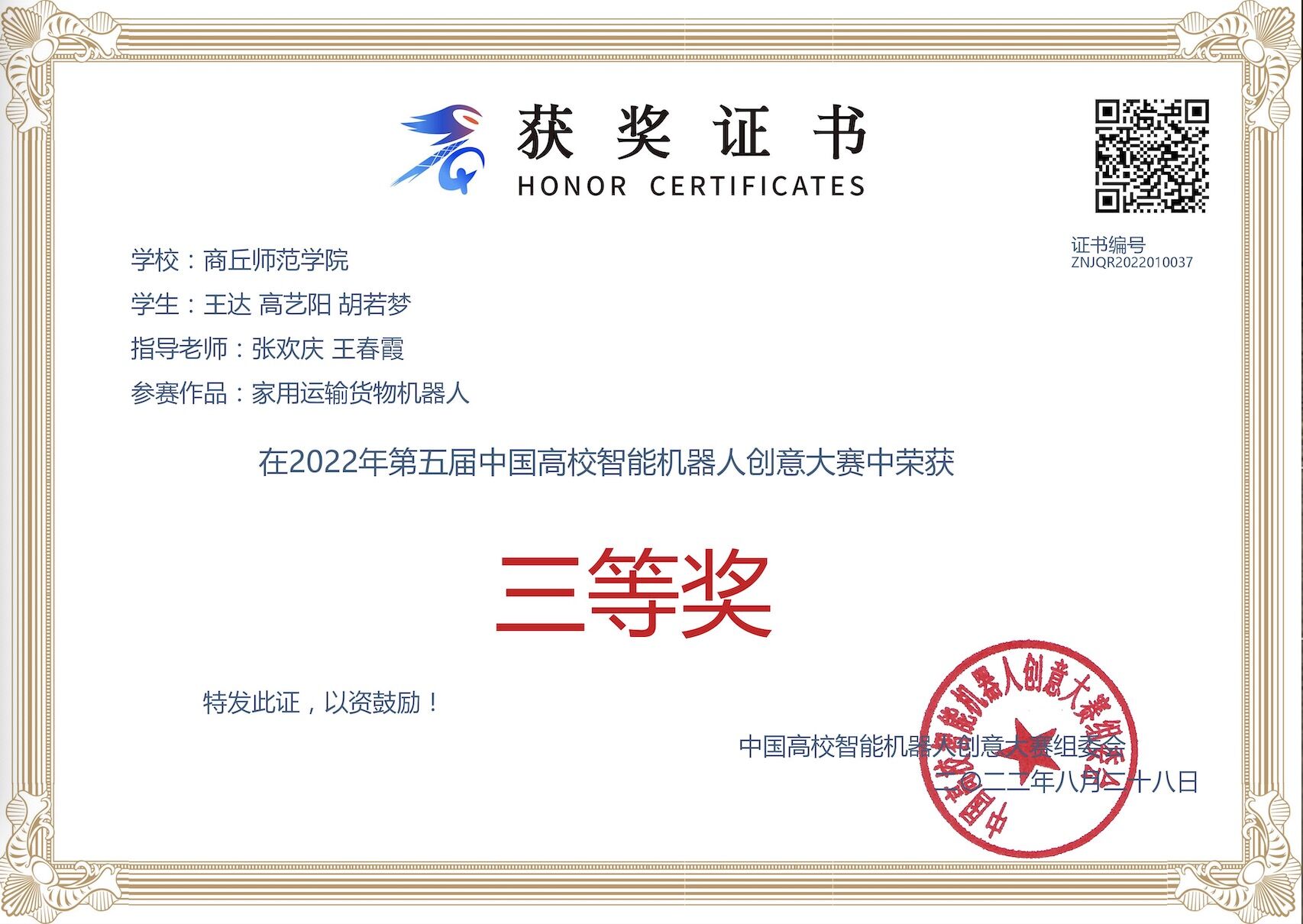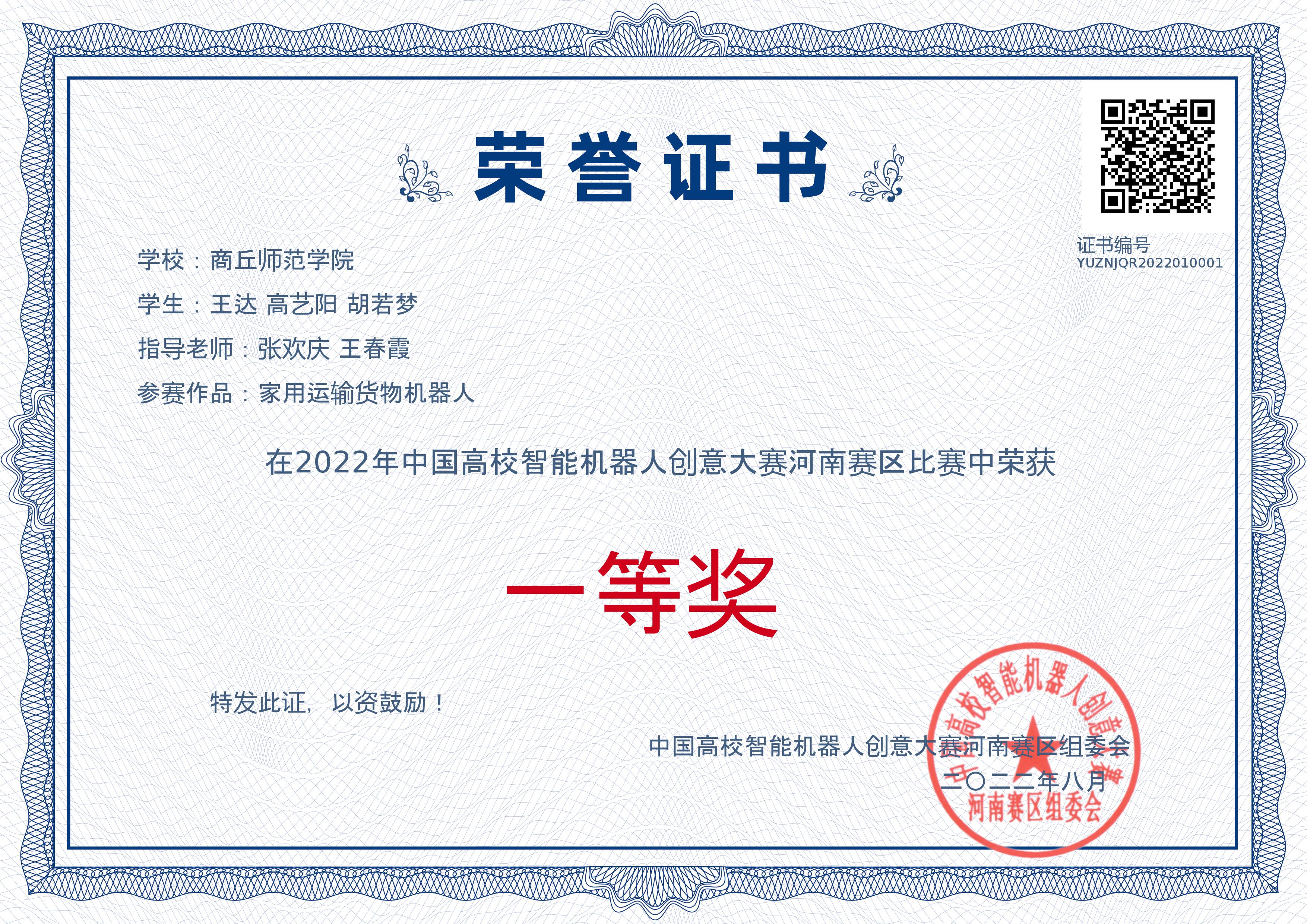 2022年8月,由首届大赛由中国高等教育学会、教育部工程图学课程教学指导委员会、中国高校智能机器人创意大赛组委会共同主办的第五届中国高校智能机器人创意大赛的获奖名单揭幕,太阳成集团tyc234cc王达等三名员工荣获省赛一等奖、国赛三等奖; 李炳坤等四名员工荣获省赛三等奖。