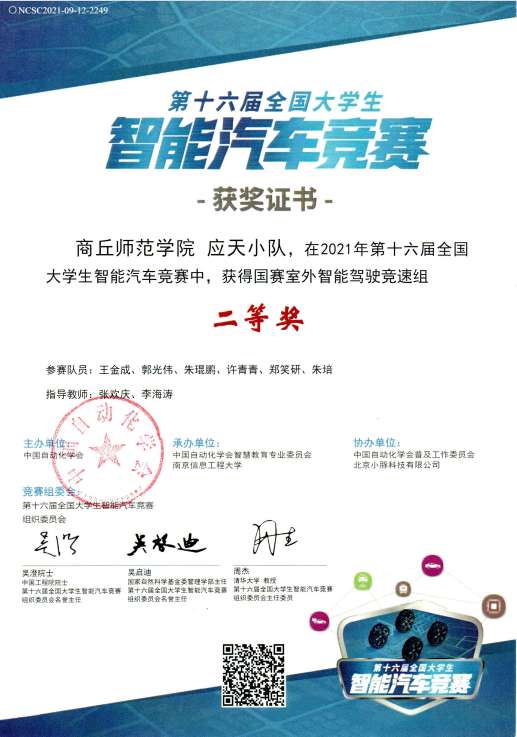 由中国自动化学会主办的第十六届全国老员工智能汽车竞赛以线上形式举办。公司太阳成集团tyc234cc教师张欢庆、李海涛担任指导老师,与六名员工共同组成“应天小队”积极报名参加并荣获第十六届全国老员工智能汽车竞赛国赛二等奖。
