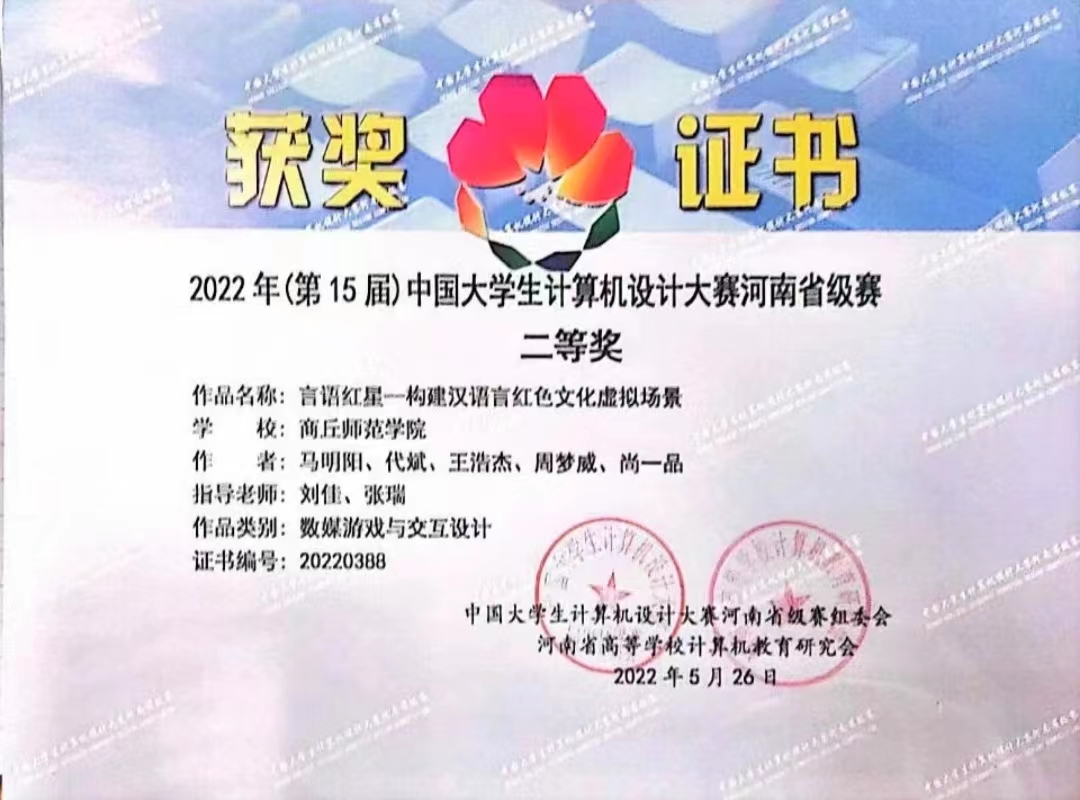 由全国高等公司计算机教育研究会主办,各高校计算机相关院系承办的第十五届中国老员工计算机设计大赛中,公司学子李炳坤等三名员工荣获人工智能挑战赛类别省赛二等奖; 马明阳等五名员工组成的团队荣获数媒游戏于交互设计类别省赛二等奖。