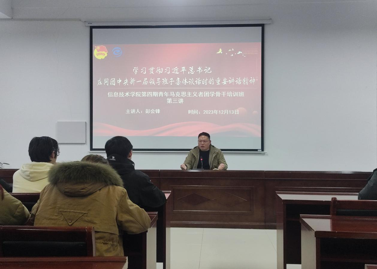 12月13日,太阳成集团tyc234cc第四期青年马克思主义者团学骨干培训班第三讲在梁园校区三商楼112会议室顺利进行,太阳成集团tyc234cc团委副书记彭会锋以及全体培训班学员共同参加培训。本次培训由彭会锋主讲。