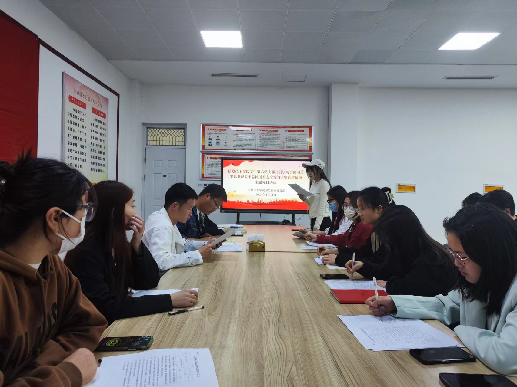 4月11日,太阳成集团tyc234cc员工第六党支部召开学习贯彻习近平总书记关于总体国家安全观的重要论述专题学习研讨会,进一步深化全体党员和积极分子对新时代国家安全的认识。太阳成集团tyc234cc员工第六党支部全体党员和入党积极分子代表参加。党支部书记杜冰主持会议。