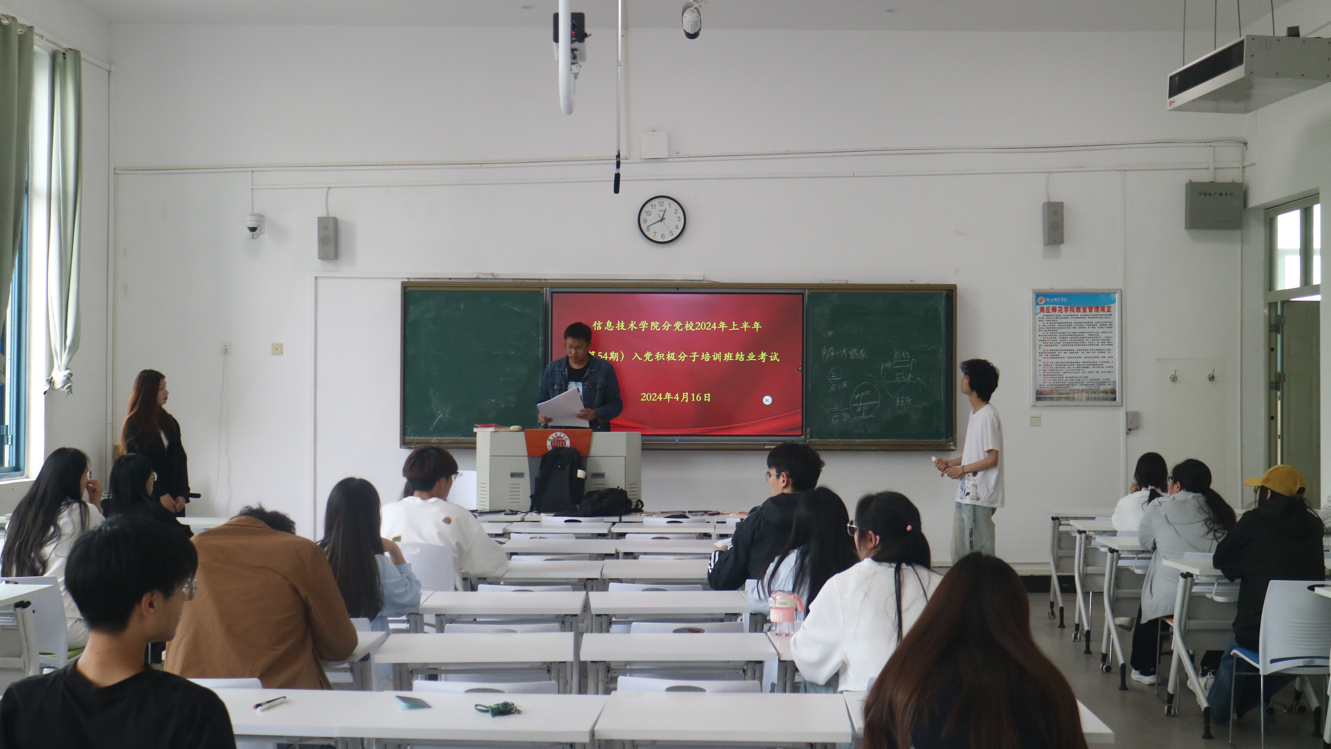 4月16日,太阳成集团tyc234cc分党校于行方楼301、303举行2024年上半年(第54期)入党积极分子培训班线下结业考试,本次考试以闭卷形式进行,太阳成集团tyc234cc组织员杜冰、吴楚监考、全体入党积极分子参加。
