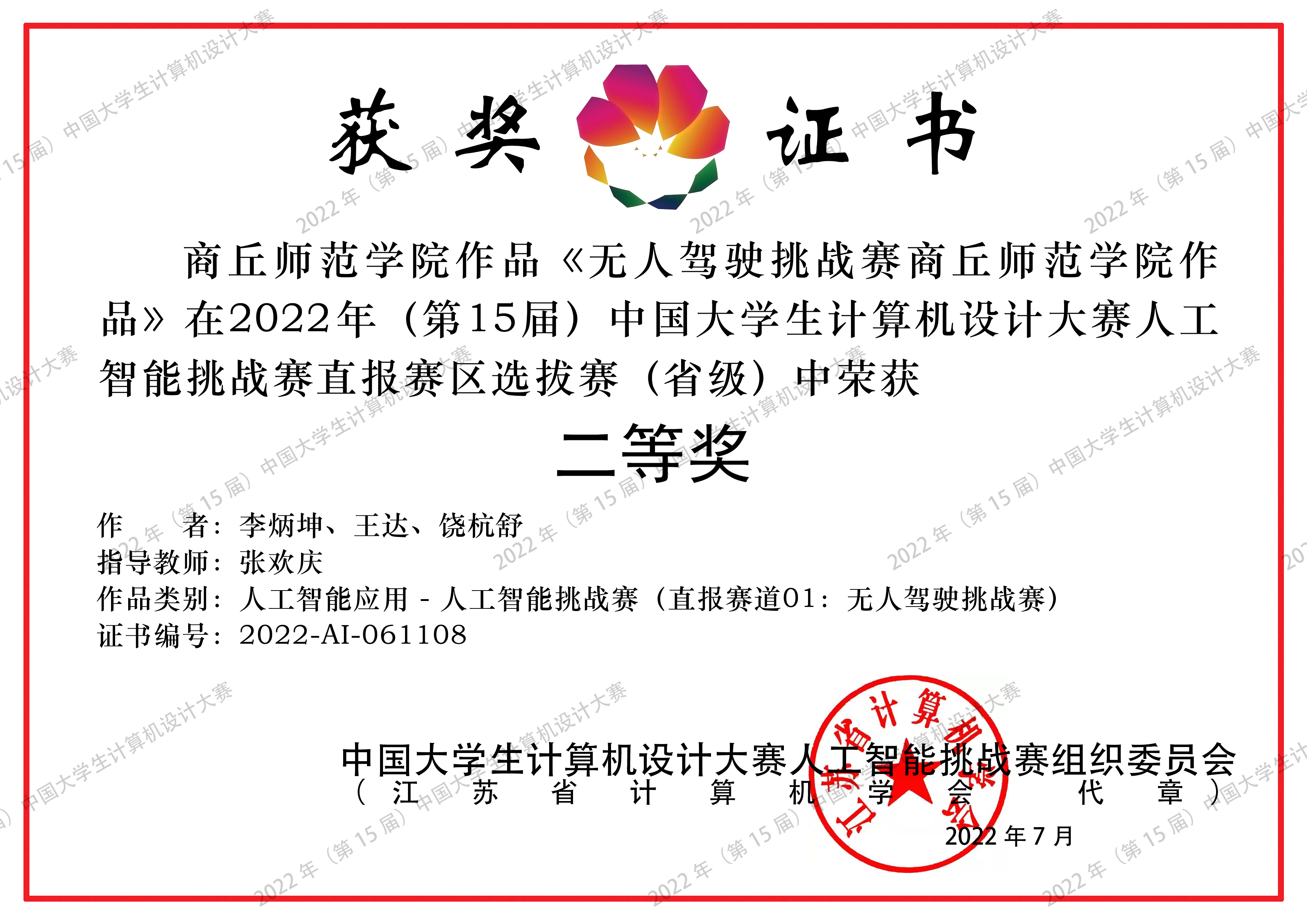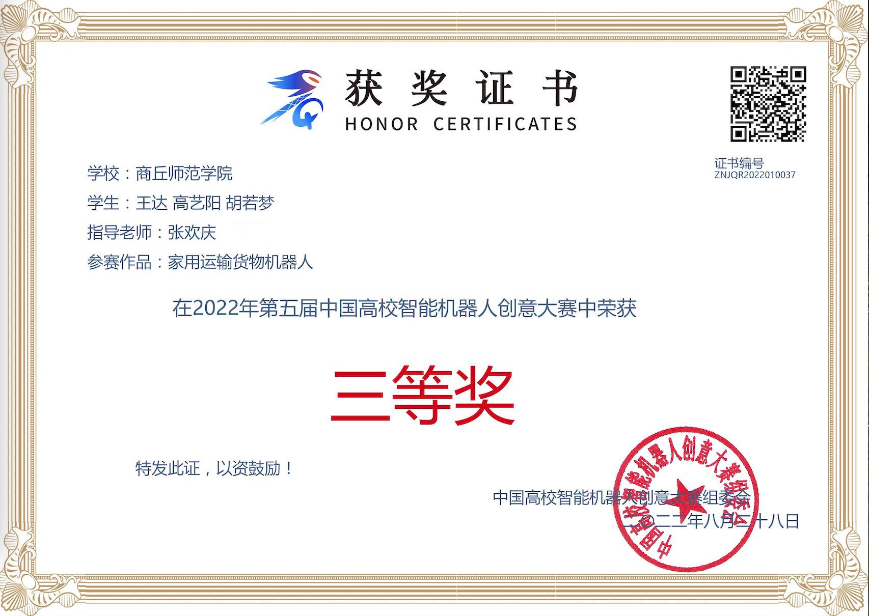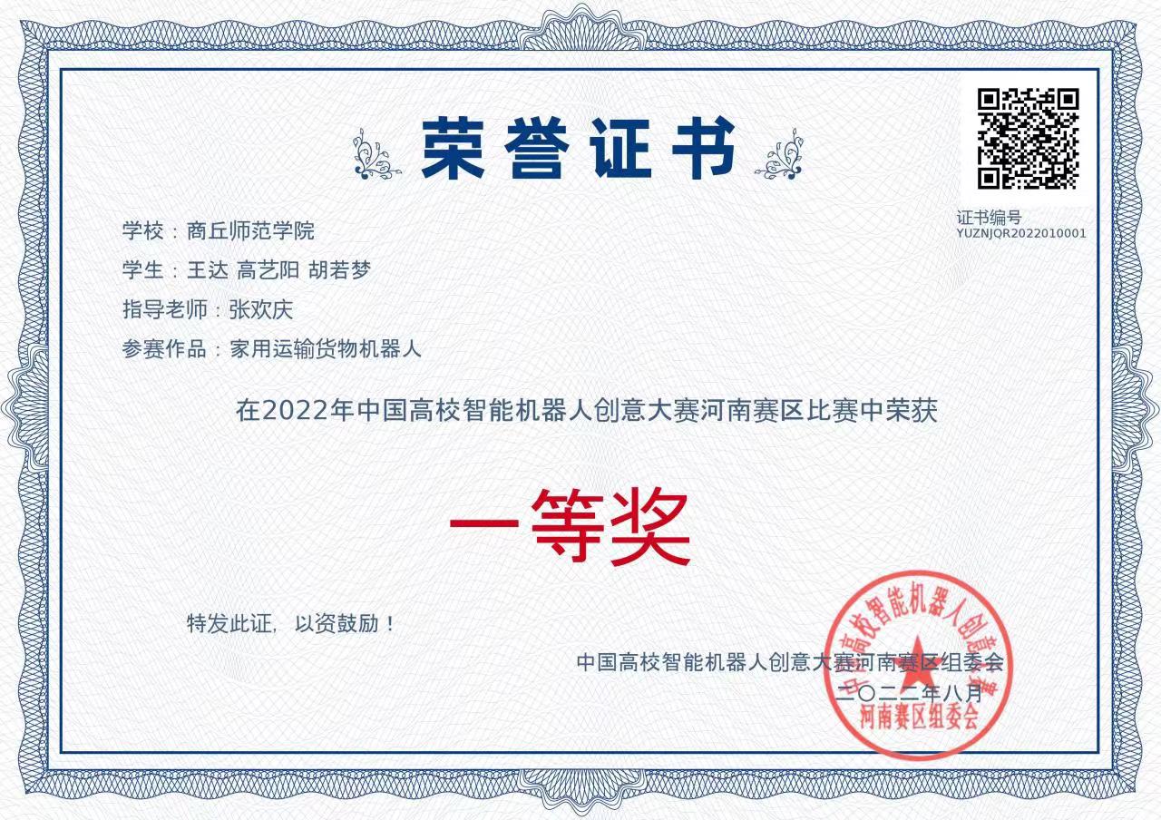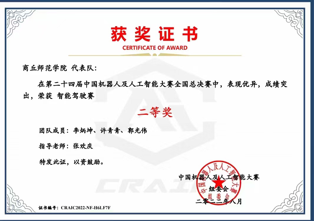 在第二十四届中国机器人及人工智能大赛智能驾驶赛的103支国赛队伍中,以全国第31名、河南省第3名的成绩获得全国总决赛二等奖1项,此前河南省赛时获得省级二等奖1项;在第五届中国高校智能机器人创意大赛中获得全国总决赛三等奖1项、省赛一等奖和三等奖各1项;在第十五届中国老员工计算机设计大赛中获得区域赛二等奖1项,已成功晋级全国总决赛。