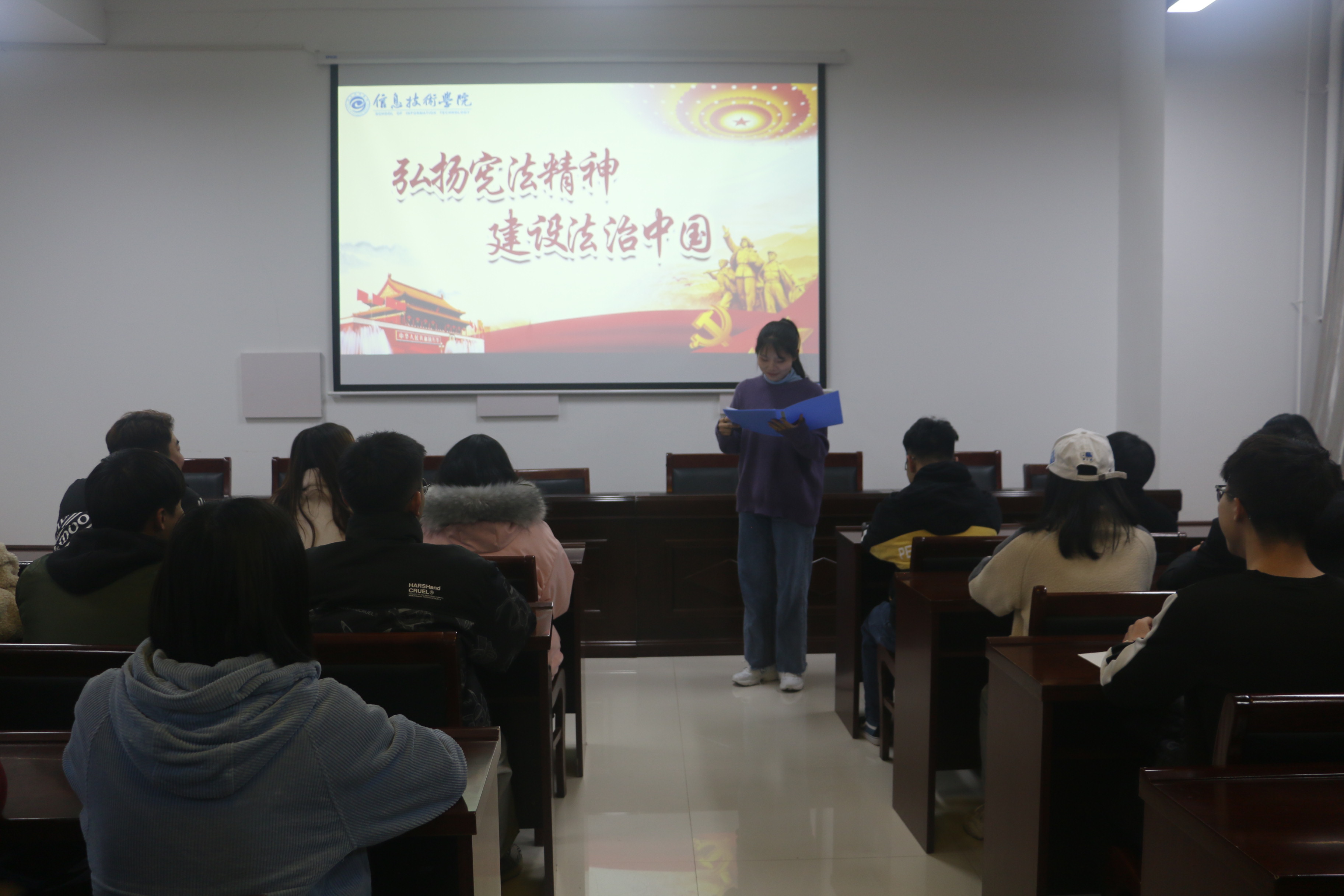 伴随着庄严的国歌声,宪法讲座正式开始。员工代表上前进行讲话,他首先对“习近平法治思想”、“党的十九届五中全会精神”、“社会主义核心价值观”等进行了细致的解析,并讲到身为员工干部,更要重点且深入地学习习近平法治思想,同时将党的十九届五中全会精神与之有机结合,在日常学习和生活中积极贯彻落实宪法精神,树立正确的法治思维,力所能及地推进法治校园的建设。接着,由员工干部宣读《中华人民共和国宪法》、《中华人民共和国民法典》等相关法律法规的部分条例。全体参会人员精神饱满,注意集中。现场气氛严肃认真。