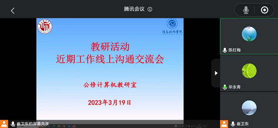 3月19日上午,公修计算机基础教研室借助腾讯会议开展教研活动,会议主题为近期工作线上沟通交流会,教研室主任崔卫东主持会议,教研室各位老师针对2023年春季学期近期有关工作开展情况积极沟通发言,气氛活跃。