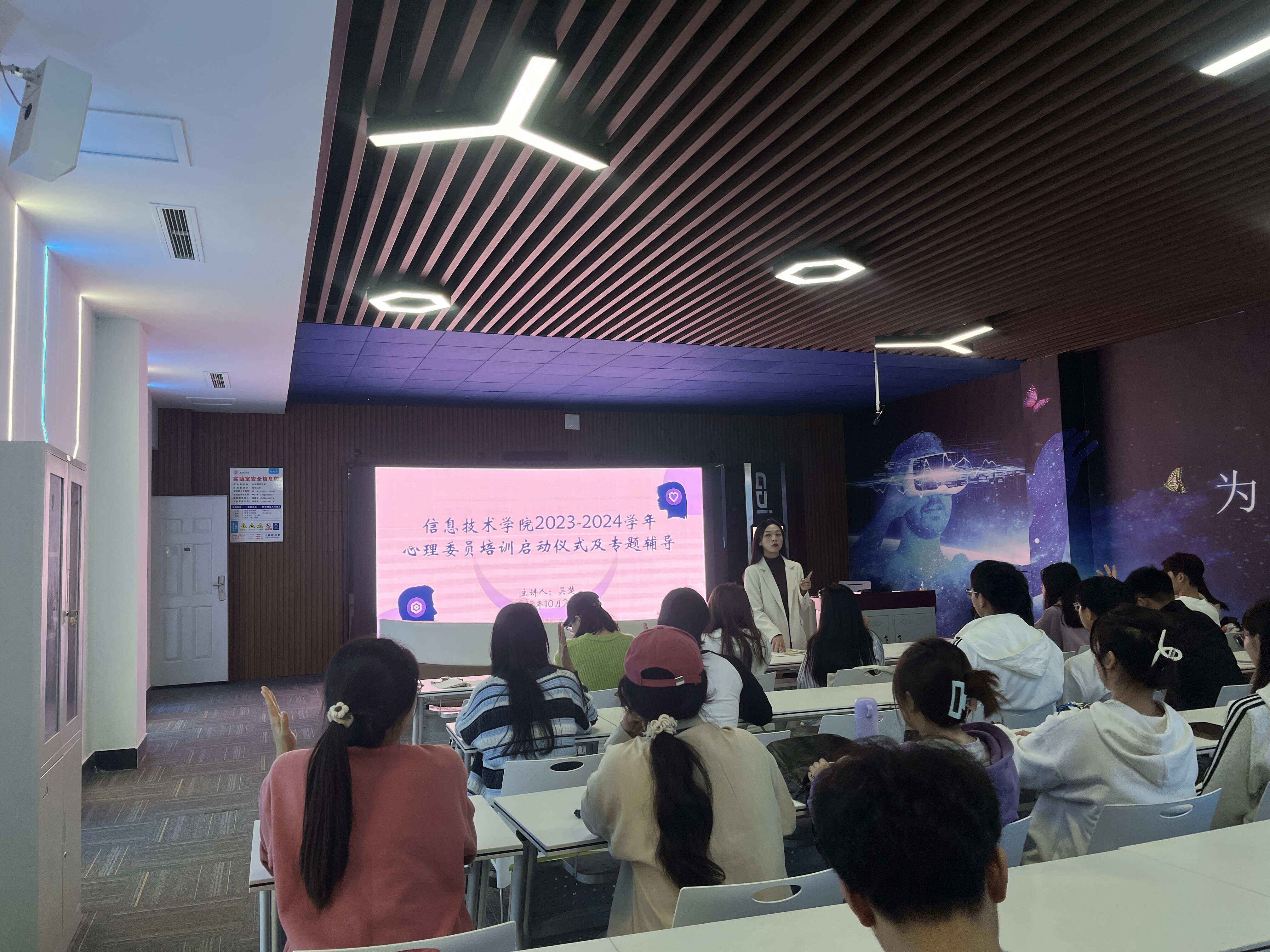 2023年10月24日,公司开展2023学年秋季学期心理委员第一期培训活动,本次活动由心灵氧吧工作室负责人吴楚主持,21级,22级,23级共40余名心理委员参与。