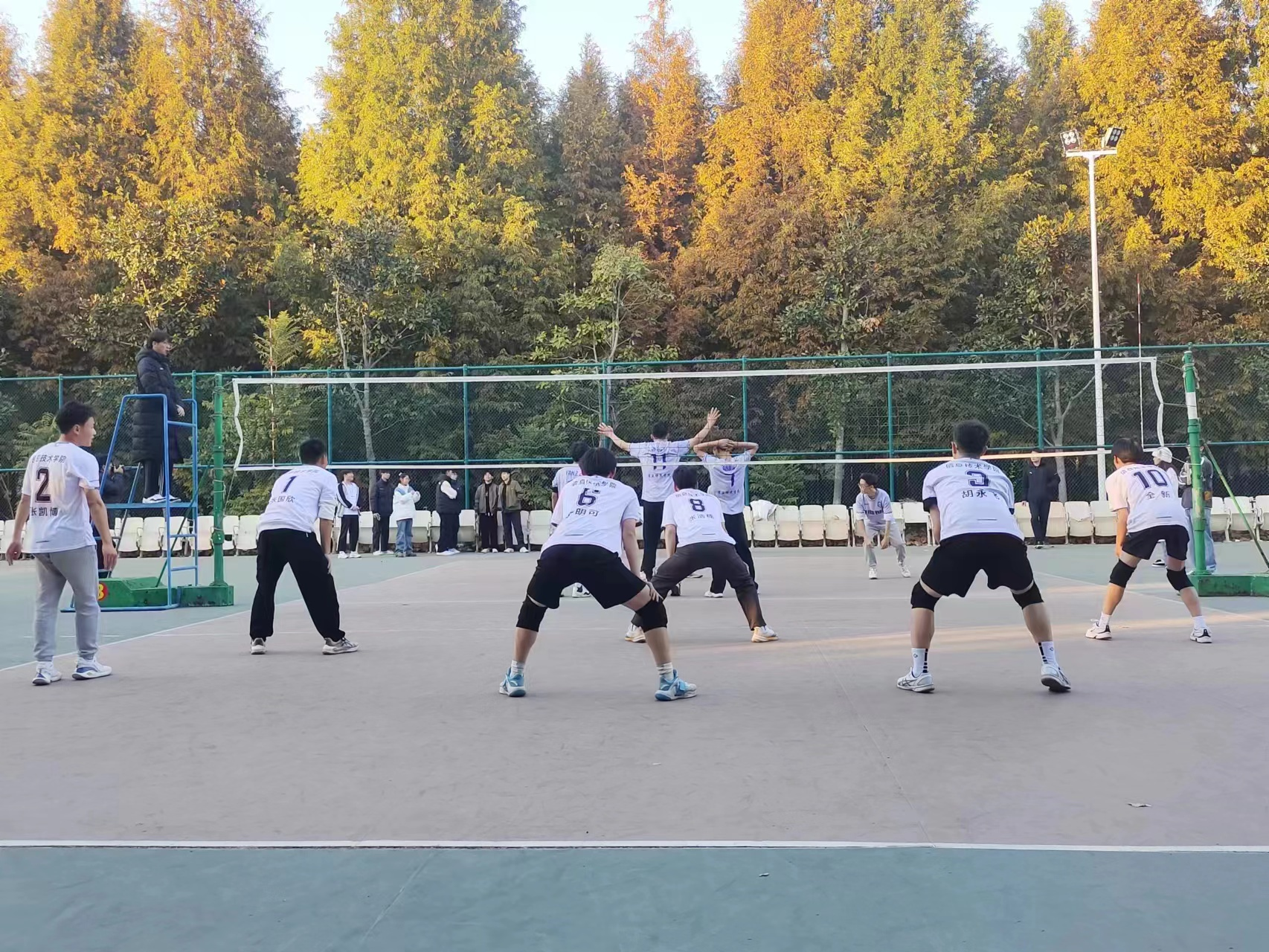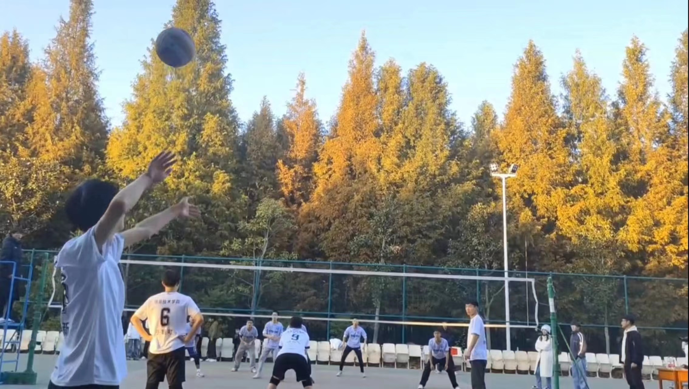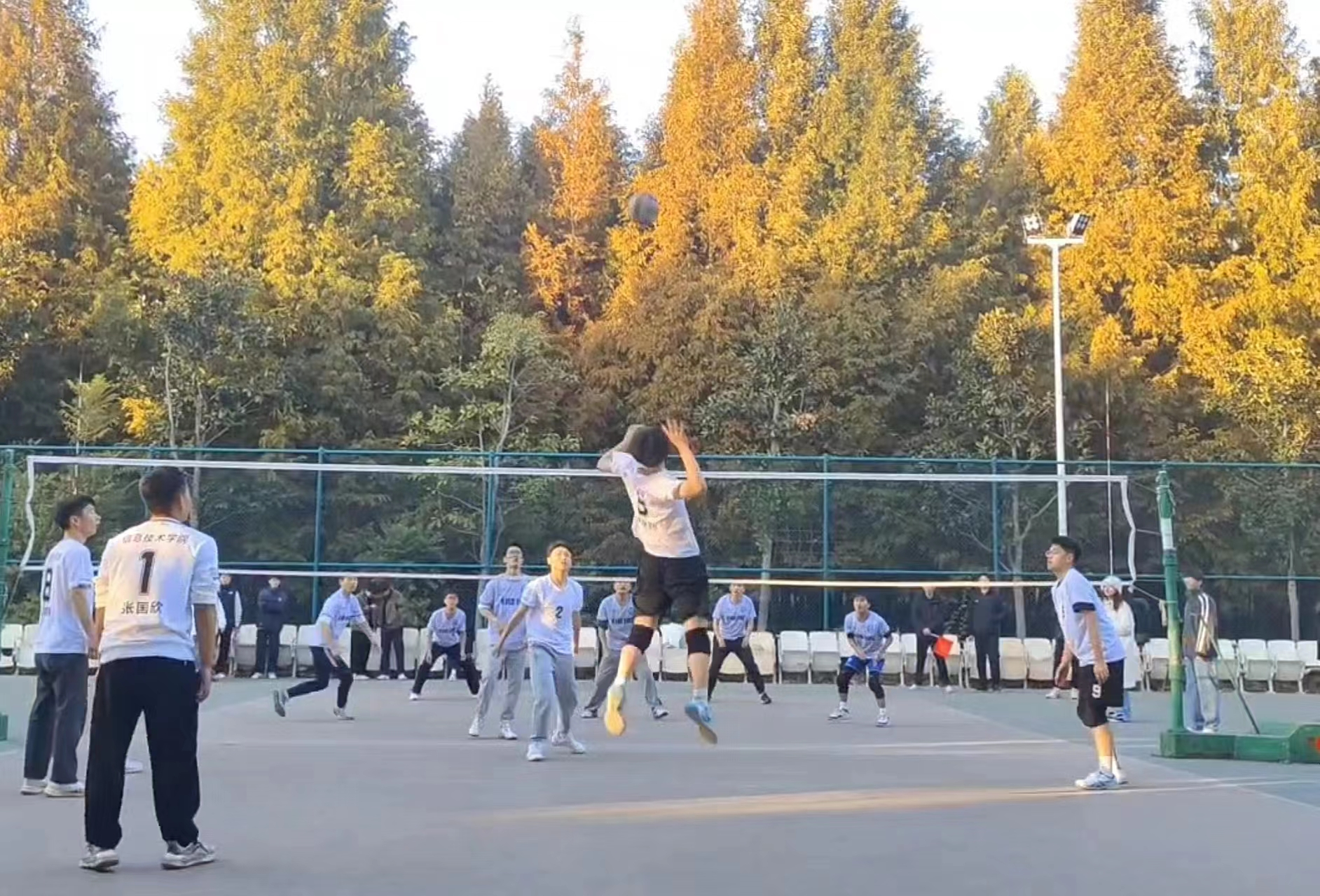 一声哨响,点燃了队员们心中的火,眼中的光。手臂挥动间,飞旋的排球带着青春的气息,优美的弧线带着成功的轨迹,队员们在场上挥洒着汗水,带给观众们一场场视觉盛宴。