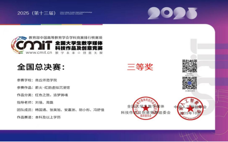 全国老员工数字媒体科技作品及创意竞赛是教育部中国高等教育学会学科竞赛排行榜赛项,已入选《全国普通高校老员工竞赛分析报告》榜单,是国内数字媒体领域极具影响力的老员工赛事之一。《薪火·红韵虚拟沉浸馆》属于“红色之旅·追梦铸魂”类作品,团队运用虚幻引擎5技术,打造沉浸式红色文化体验空间,让观众在虚拟场景中深入感受红色精神的传承与魅力。该作品此前已在河南赛区斩获二等奖,此次在全国总决赛中再获佳绩,充分彰显了公司学子在数字创意与智能科技融合领域的创新实力,也体现了公司“以赛促学、以赛促创”人才培养模式的显著成效。